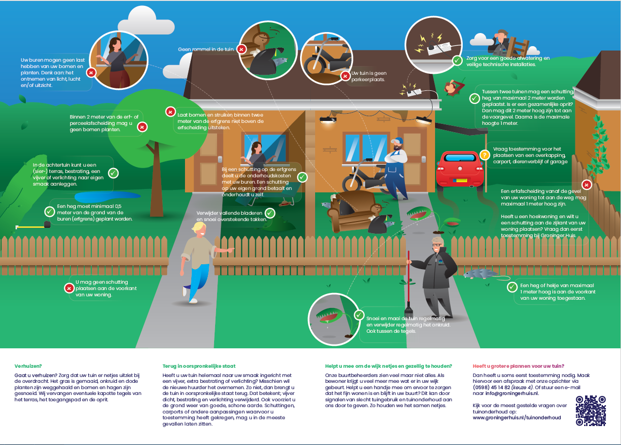Wij verwachten dat u ervoor zorgt dat uw tuin er netjes onderhouden uit ziet. Dit betekent dat u regelmatig gras maait en onkruid verwijdert, ook tussen tegels. Als u een heg hebt snoeit u deze regelmatig. Deze tips en meer vindt u op onze website, u vindt hier ook een leuke folder waarin u ziet wat we van u verwachten.