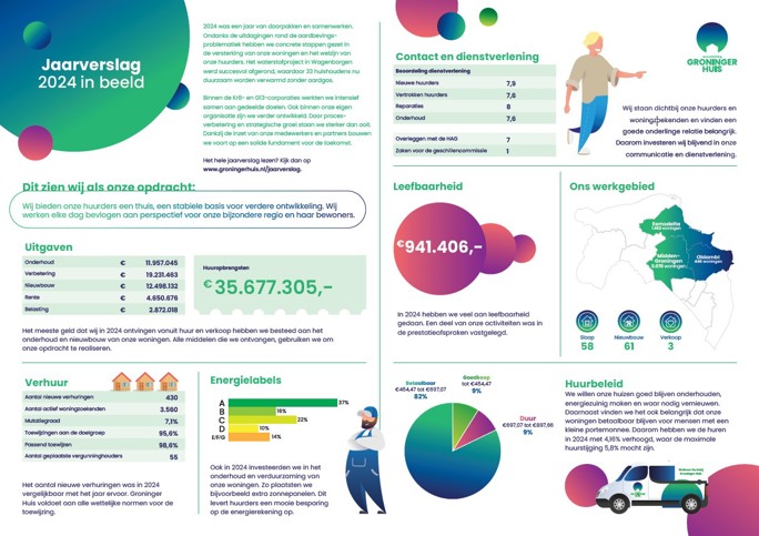 2024 was een jaar van doorpakken en samenwerken. Ondanks de uitdagingen rond de aardbevingsproblematiek hebben we concrete stappen gezet in de versterking van onze woningen en het welzijn van onze huurders. Het waterstofproject in Wagenborgen werd succesvol afgerond, waardoor 33 huishoudens nu duurzaam worden verwarmd zonder aardgas.
