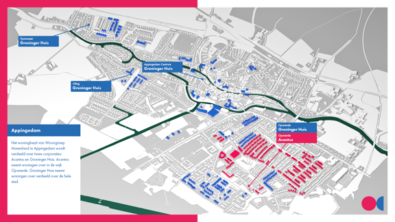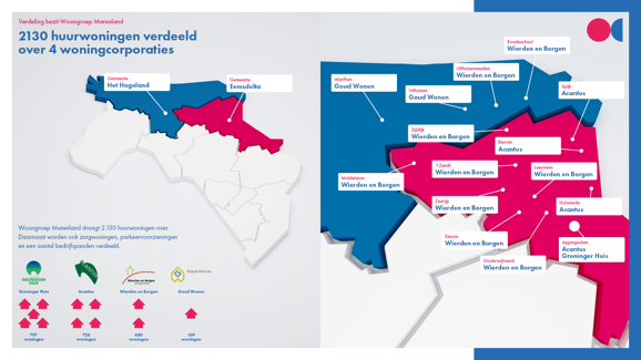 Woongroep Marenland had bezit in de gemeente Eemsdelta en de gemeente Het Hogeland. Er is gekozen voor een gebiedsgerichte verdeling van de woningen. Dit sluit aan bij de gebiedsgerichte werkwijze van de woningcorporaties in het aardbevingsgebied. Concreet betekent deze stap dat Groninger Huis 797 woningen overneemt in Appingedam. Acantus neemt 724 woningen over in Appingedam, Spijk, Holwierde en Bierum. Wierden en Borgen neemt 440 woningen over in 't Zandt, Zijldijk, Zeerijp, Eenum, Oosterwijtwerd, Middelstum, Roodeschool, Leermens en Uithuizermeeden. Goud Wonen neemt 169 woningen over in Uithuizen en Warffum.