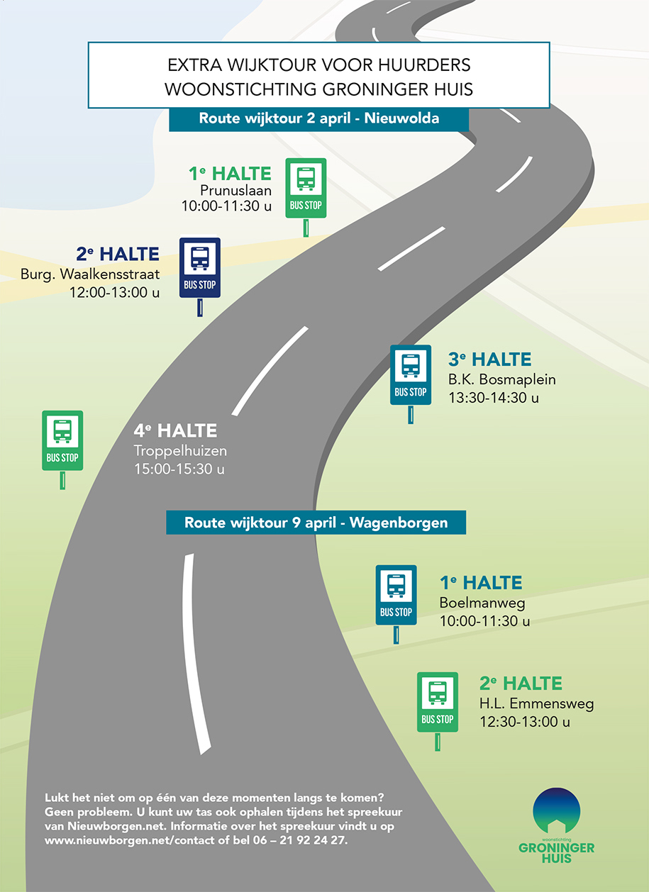 Huurders van Woonstichting Groninger Huis uit Nieuwolda en Wagenborgen die nog geen Bespaartas via nieuwborgen.net hebben opgehaald, kunnen dit op zaterdag 2 en 9 april alsnog doen. De Waarmtebus stopt op deze dagen op verschillende plekken in beide dorpen. In de Waarmtebus kunnen huurders gratis hun persoonlijke Bespaartas samenstellen met artikelen t.w.v. € 50,-.