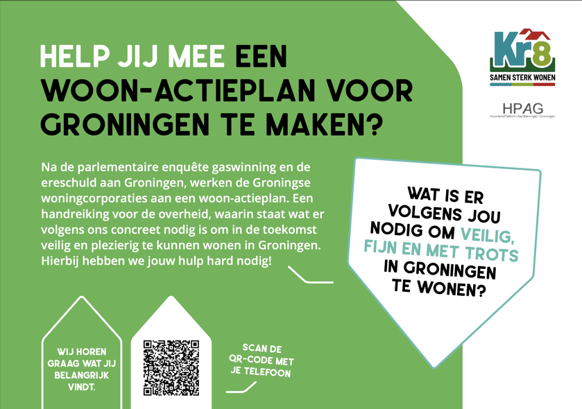 Na de parlementaire enquête gaswinning en de ereschuld aan Groningen, werken wij als Kr8-corporaties aan een woon-actieplan. Een handreiking voor de overheid, waarin staat wat er volgens ons concreet nodig is om in de toekomst veilig en plezierig te kunnen wonen in Groningen. Hierbij hebben wij de hulp van onze huurders in het aardbevingsgebied hard nodig.