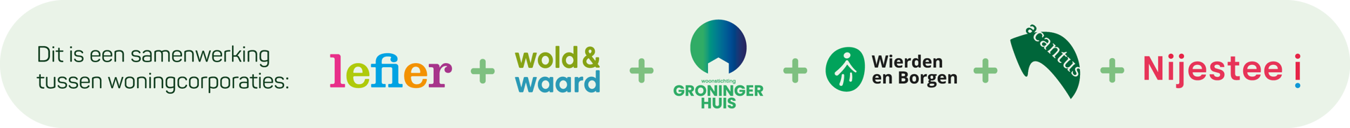 Wij zijn GewOON Groen. Zes woningcorporaties Acantus, Wierden en Borgen, Groninger Huis, Lefier, Wold & Waard en Nijestee die samenwerken om meer impact te maken voor onze huurders. Samen verhuren wij ruim 75.000 sociale huurwoningen in de provincies Groningen en Drenthe. We zijn sterk geworteld in onze werkgebieden met eigen kenmerken en cultuur. Tegelijkertijd worden we in onze verduurzamingsopgave voor grote uitdagingen gesteld en vissen we qua markt en techniek in dezelfde vijver. Door onze kennis en krachten te bundelen, maken we het mogelijk om op te schalen en onze sociale huurwoningen sneller te verduurzamen.